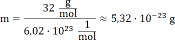 Wyznacz masę jednej cząsteczki tlenu w zbiorniku, wiedząc, że zawarta w nim masa gazu wynosi 2 g, a masa molowa tlenu jest równa 32 g/mol.