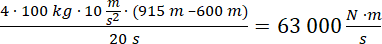 Podczas jednego kursu trwającego 20 s, wyciąg przewiezie 4 osoby. Wykonana przez nią praca (W) to zmiana energii potencjalnej (∆Ep), jaka nastąpiła podczas przejazdu między stacjami. Stąd, moc wyciągu (P) będzie równa stosunkowi zmiany tej energii do czasu trwania jednego przewozu.