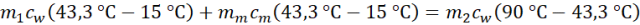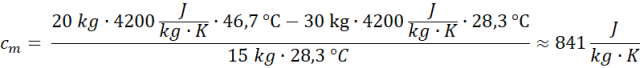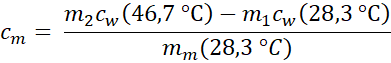 Ciepło oddane przez dolaną wodę jest pobrane przez wodę i wanienkę. Zapisujemy równość i przekształcamy ją, aby otrzymać wzór na ciepło właściwe materiału, z którego wykonana jest wanienka.
