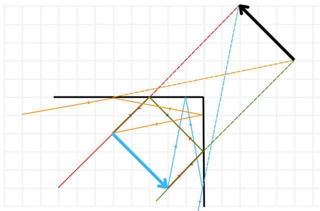 Narysuj dwa promienie wychodzące z drugiego końca strzałki i ich przebieg w układzie. Sprawdź, w którym punkcie przetną się ich przedłużenia po dwukrotnym odbiciu od zwierciadeł.