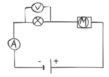 Na rysunku zachowano warunki zadania. Znajduje się woltomierz, który jest połączony równolegle do żarówki, natomiast żarówka i silnik – szeregowo.