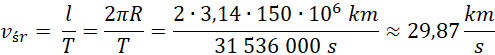 Oblicz średnią szybkość ruchu Ziemi, jeśli orbita Ziemi jest okręgiem o promieniu , a okres obiegu . Wynik wyraź w km/s.