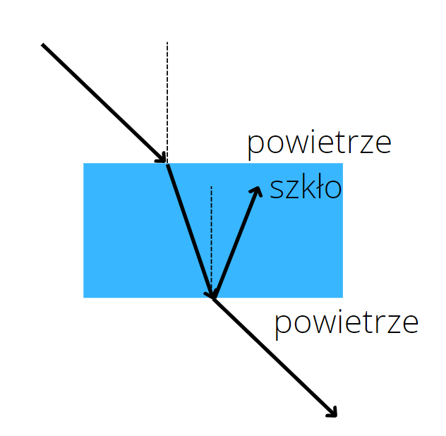 Narysuj, promienie odbite, które nie ulegają załamaniu od granicy powietrze – szkło i szkło – powietrze.