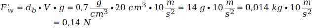 Niech gęstość benzyny to będzie db, a siła wyporu w benzynie to F’w. Siła wyporu zmieni się i wyniesie: