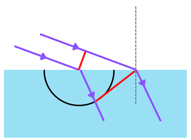 Korzystamy ze sposobu przedstawionego na rycinie 14.2. Długość promienia okręgu możemy powiązać z długością fali w powietrzu za pomocą współczynnika załamania światła.