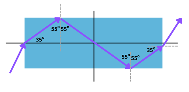 Kąt padania na poziomą ściankę szkła jest większy niż kąt graniczny, więc zajdzie całkowite wewnętrzne odbicie. Gdy promień pada na pionową ściankę, kąt padania jest mniejszy niż kąt graniczny, więc promień przejdzie do powietrza, załamując się w kierunku „od normalnej”.
