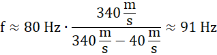 Oblicz, jaką częstotliwość będzie odbierał obserwator stojący przy przejeździe kolejowym, jeśli zbliża się do niego pociąg z prędkością z częstotliwością syreny równą 80 Hz.