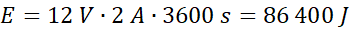 Korzystamy ze wzoru na energię. Wiemy, że ładunek to iloczyn natężenia prądu i czasu. Nie zapominamy o zamianie jednostek na jednostki w układzie SI (godziny na sekundy).