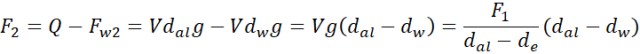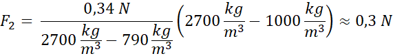 Wypisujemy dane z treści zadania i wartości gęstości poszczególnych cieczy znalezione w tabeli na końcu podręcznika. Z przypadku 1. otrzymujemy wartość iloczynu objętości śruby i przyspieszenia ziemskiego. Wykorzystujemy ją przy rozpatrywaniu drugiego przypadku, czyli zanurzenia w wodzie.