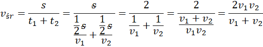 . Samochód całą trasę s przejechał w czasie pokonania pierwszej i drugiej połówki. Dlatego wyznaczamy wzory na czasy pokonania poszczególnych połów. Następnie we wzorze na prędkość średnią dodajemy je do siebie.