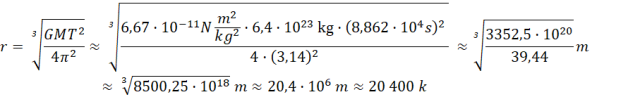 Na początku wypisujemy dane korzystając z treści zadania. Następnie zapisujemy dwa wzory na prędkość: orbitalną oraz w ruchu jednostajnym po okręgu. Przyrównujemy je do siebie i przekształcamy w taki sposób, aby otrzymać wzór na promień orbity. Podstawiamy wartości liczbowe i otrzymujemy wynik.