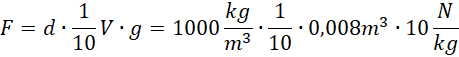 Z prawa Archimedesa wiadomo, że na każde ciało zanurzone w cieczy lub gazie działa siła wyporu równa co do wartości ciężarowi wypartej przez to ciało cieczy, lub wypartego przez to ciało gazu, zatem siła wyporu jest równa ciężarowi zabawki. Korzystamy ze wzoru na siłę wyporu. Zabawka zanurzona jest w 1/10, zatem mnożymy wartość objętości razy 1/10. W obliczeniach należy pamiętać o odpowiednich jednostkach. Gęstość wody to