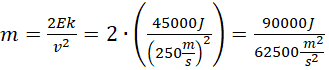 Przekształcamy wzór na energię kinetyczną i obliczamy na tej podstawie masę. Należy pamiętać o zamianie prędkości z kilometrów na godzinę na metry na sekundę.