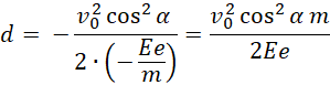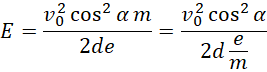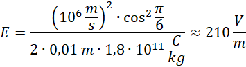 Maksymalna wartość natężenia pola występuje w przypadku, gdy elektron doleci do okładki ujemnej i w chwili końcowej jego prędkość wynosi 0. Wykorzystujemy wzory na drogę i przyspieszenie w ruchu jednostajnie opóźnionym, jaki występuje na kierunku y ruchu elektronu. Na ich podstawie otrzymujemy wzór na drogę, jaką przebył elektron. Wyznaczamy wzory na prędkość na kierunku y oraz opóźnienie ruchu. Na koniec łączymy wszystkie wzory ze sobą i podstawiamy odpowiednie dane liczbowe.