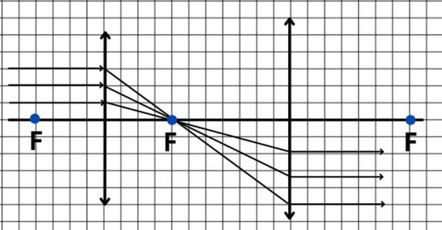 Po przejściu promieni przez soczewkę promienie się skupiają w ogniskowej, od której będą się rozpraszać do trafienia na drugą soczewkę, która skupi je z powrotem do wiązki równoległej.