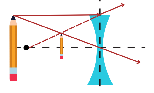 W soczewce rozpraszającej przedłużenie promienia rozproszonego przechodzi przez ognisko (po stronie przedmiotu).