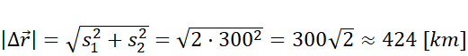 Samolot przeleciał 300 km w linii prostej, a następnie kolejne 300 km pod kątem prostym do poprzedniego toru ruchu. Wektor przemieszczenia, łączący punkt początkowy z punktem końcowym, tworzy więc z torem ruchu trójkąt prostokątny, w którym jest on przeciwprostokątną. Przemieszczenie zatem: