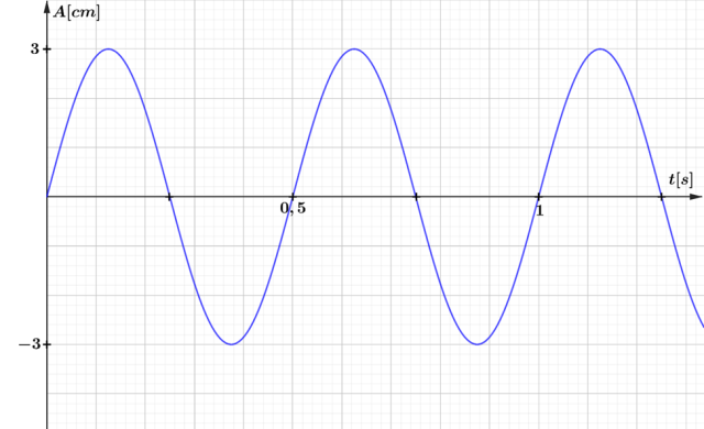 Amplituda (A) to maksymalne wychylenia ciała z położenia równowagi – jest to położenie maksymalne (A = 3 cm) i minimalne (A = -3 cm). Okresem (T) nazywamy czas jednego pełnego drgania, czyli czas, który mija między chwilami, w których następują dwa kolejne maksymalne wychylenia w górę lub w dół.