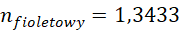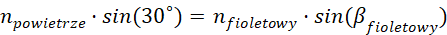 Początkowo promień światła białego pada na wodę pod kątem 30°. Kiedy światło przechodzi z powietrza do wody, różne kolory światła są różnie załamywane ze względu na ich różne długości fali. W tym przypadku, światło fioletowe i czerwone mają nieco różne współczynniki załamania w wodzie, co prowadzi do różnicy w kątach załamania. Obliczając kąty załamania dla obu kolorów i odejmując je od siebie, możesz znaleźć kąt pomiędzy załamanym promieniem fioletowym a załamanym promieniem czerwonym.