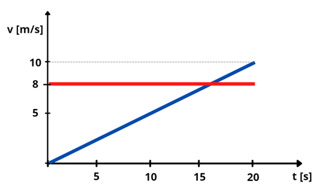 Na początku oblicz prędkość końcową autobusu po 20 sekundach ruchu. Zaznaczamy ten punkt na wykresie i rysujemy do niego linię prostą od punktu (0,0). Oznacza ona ruch jednostajnie przyspieszony. Ruch rowerzysty rysujemy na wykresie jako linię poziomą na wysokości