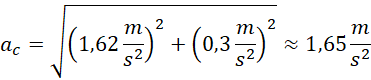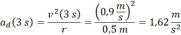 Wartość przyspieszenia całkowitego obliczamy, korzystając z twierdzenia Pitagorasa, gdzie przyprostokątnymi trójkąta są przyspieszenie dośrodkowe i przyspieszenie styczne. Przyspieszenie dośrodkowe po trzech sekundach obliczamy, korzystając z odpowiedniego wzoru, a przyspieszenie styczne odczytujemy ze wzoru na prędkość liniową (