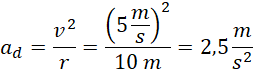 Oblicz wartość przyspieszenia dośrodkowego i przyspieszenia całkowitego Radka w punkcie, gdzie promień krzywizny toru ma 10 m, szybkość Radka wynosi 5 m/s, a jego przyspieszenie styczne ma wartość 2,5 m/s2.