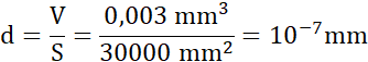 Kropla oliwy o objętości 0,003 mm3 rozpłynęła się po powierzchni wody i zajęła powierzchnię 300 cm2. Policz średnicę kropli oliwy, jeśli jest równa grubości warstwy oliwy na powierzchni cieczy.