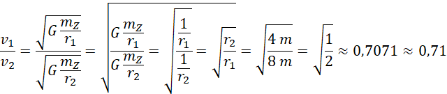 W tym zadaniu musisz policzyć, jaki jest iloraz prędkości orbitalnej satelity S1 oraz satelity S2. Pamiętaj, że wynik należy zaokrąglić do 2 cyfr znaczących.