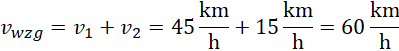 Grupa zawodników podczas wyścigu porusza się z prędkością , jednak jeden z nich postanowił oddalić się od reszty z prędkością . Policz, jaka jest jego prędkość względem osoby, która stoi na poboczu ulicy i patrzy na wyścig.