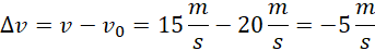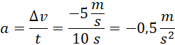 Przyspieszenie jest równe stosunkowi przyrostu prędkości do czasu, w jakim on nastąpił. Zakładamy zwrot zgodny z osią x. Wynik jest ujemny, więc zwrot jest przeciwny do zakładanego.
