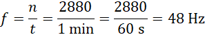 Oblicz częstotliwość obrotów kosiarki oraz czas jednego obrotu wiedząc, że jej ostrze wykonuje 2880 obrotów na minutę.