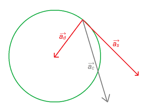 Wektory przyspieszenia stycznego i dośrodkowego są do siebie prostopadłe, a ich wypadkowa to przyspieszenie całkowite: