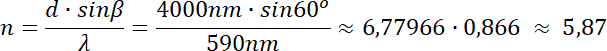 W podpunkcie c) korzystamy ze wzoru opisującego interferencję na siatce dyfrakcyjnej i obliczamy rząd prążków