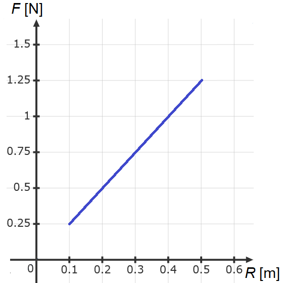 W tarczy zrobiono wyżłobienie o promieniu wewnętrznym 10 cm i zewnętrznym 50 cm, tak, jak pokazano to na rysunku. W środku tarczy umieszczono metalowy krążek, którego masa wynosiła 0,1 kg. Wyznacz zależność siły dośrodkowej, która działa na krążek, od promienia okręgu przy stałej prędkości kątowej. Następnie narysuj wykres tej zależności dla prędkości kątowej 5 w zakresie od 10 cm do 50 cm.