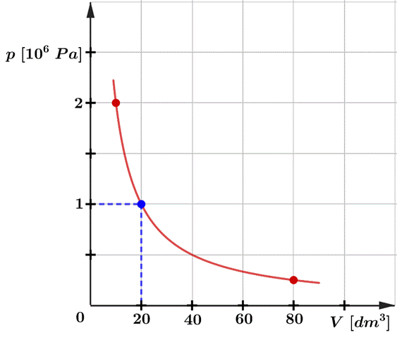 Najpierw z wykresu odczytaj dowolny punkt i przypisane mu wartości ciśnienia i objętości oraz wyraź temperaturę w kelwinach, wiedząc, że zachodzi relacja