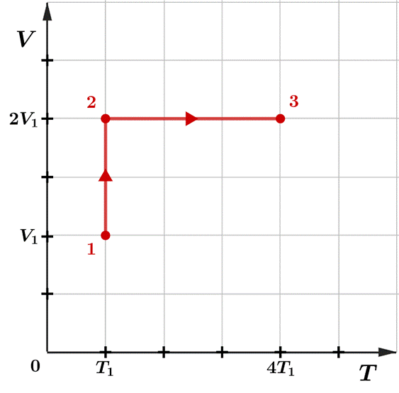 Podczas przejścia między stanem 2 a 3 objętość gazu jest stała, a wzrasta jego temperatura. W takim razie jest to przemiana izochoryczna.