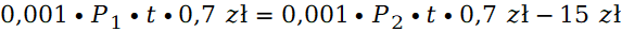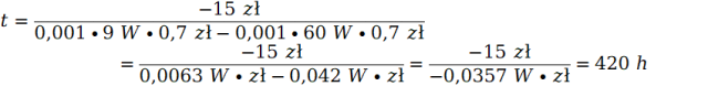 . Pracę zamień z definicji mocy, pamiętając o podzieleniu przez 1000, gdyż ceny te są słuszne dla kilowatogodziny, czyli dla tysiąca watogodzin. Przekształć wzór by otrzymać szukany czas.