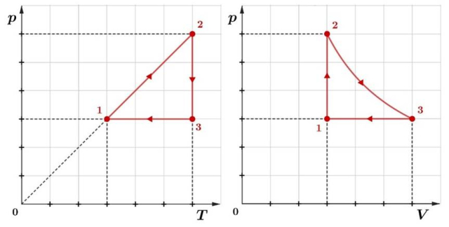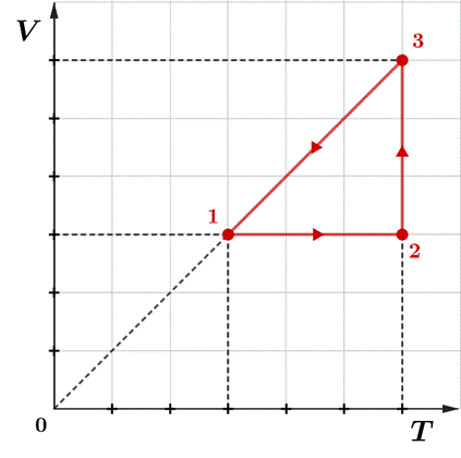Zauważ, że przemiana 1 → 2 jest izochoryczna, ponieważ nie zmienia się objętość. Wówczas temperatura wzrosło dwukrotnie, więc zgodnie z równaniem Clapeyrona ciśnienie musiało wzrosnąć 2 razy.