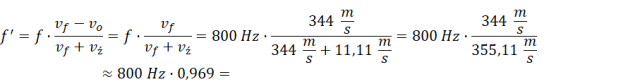 Wyznacz częstotliwość dźwięku, odbieranego przez osobę, do której zbliża się i od której oddala się samochód z prędkością 40 km/h, wiedząc, że dźwięk klaksonu ma częstotliwość 800 Hz.