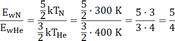 Wyznacz stosunek energii wewnętrznych dwóch gazów o jednakowych liczbach cząsteczek: azotu, którego temperatura wynosi 27°C i helu w temperaturze 127°C.
