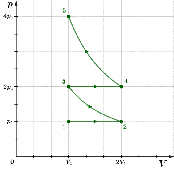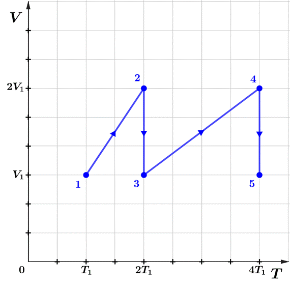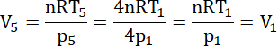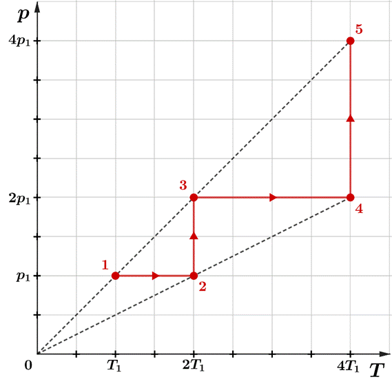 Zauważ, że skoro przemiana 4 → 5 jest izotermiczna, to temperatura w stanie 5 jest taka sama jak w stanie 4