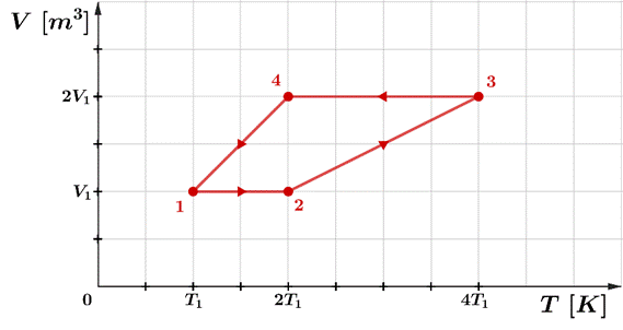 Zauważ, że skoro przemiana 1 → 2 jest izochoryczna, to objętość w stanie 2 jest taka sama jak w stanie 1