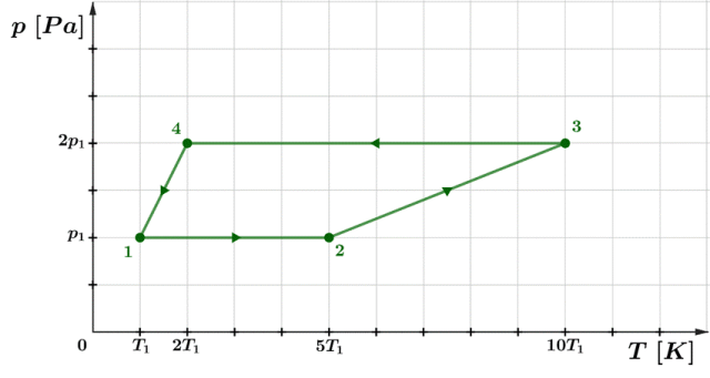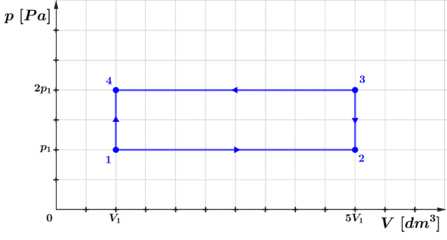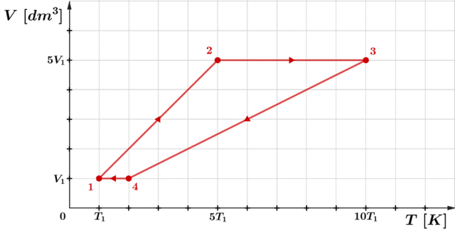 Zaznacz w układzie punkty odpowiadające poszczególnym stanom gazu. Zauważ, że w przypadku przemian izobarycznych 1 → 2 oraz 4 → 3 mamy do czynienia z funkcją stałą. Natomiast podczas przemian 2 → 3 i 4 → 1, które są izochoryczne, gdzie objętość jest stała, mamydo czynienia z prostą