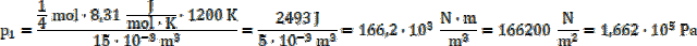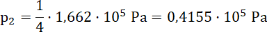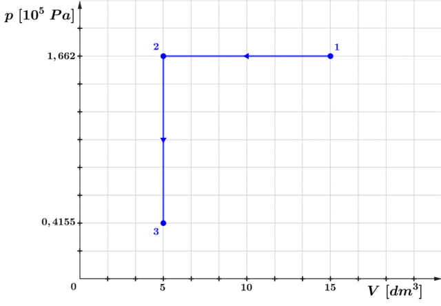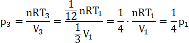 Z wykresu można oczytać, że objętość nie uległa zmianie, ale temperatura zmniejszyły się czterokrotnie. W takim razie jest to przemiana izochoryczna, więc ciśnienie w stanie 3 jest cztery razy mniejsze niż w stanie 2.