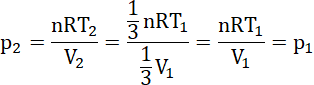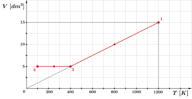 Z wykresu można oczytać, że zarówno objętość, jak i ci temperatura zmniejszyły się trzykrotnie. W takim razie jest to przemiana izobaryczna, czyli ciśnienie w stanie 2 jest takie samo jak w stanie 1.