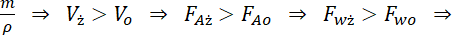 Zauważ, że skoro ciężary kawałków są takie same, to ich masy także. Na podstawie danych z tablic fizycznych, wiemy, że gęstość ołowiu jest większa od gęstości żelaza. Stąd wynika, że przy jednakowych masach, objętość kawałka żelaza jest większa. Zgodnie z prawem Archimedesa, siła wyporu działająca na kawałek żelaza będzie większa niż w przypadku ołowiu. Zgodnie z zasadami dynamiki większą wartość będzie miała siła wypadkowa dla ołowianego kawałka (jest ona różnicą sił ciężkości i wyporu, które są skierowane w przeciwne strony). Stąd fakt, że szalka przechyli się w stronę ołowiu.