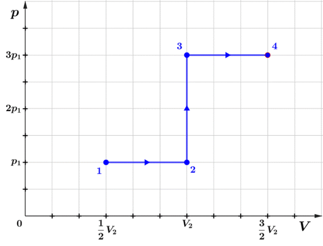 Zaznacz w układzie punkty odpowiadające poszczególnym stanom gazu. Zauważ, że w przypadku przemian izobarycznych 1 → 2 oraz 3 → 4 mamy do czynienia z funkcją stałą, ponieważ ciśnienie nie ulega zmianie. Natomiast podczas przemiany 2 → 3, która jest izochoryczna objętość jest stała, więc mamy do czynienia z prostą