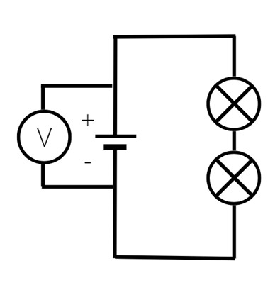 Narysuj schemat obwodu elektrycznego składającego się z baterii i dwóch żarówek połączonych szeregowo, a następnie dorysuj do niego woltomierz mierzący napięcie na zaciskach baterii.