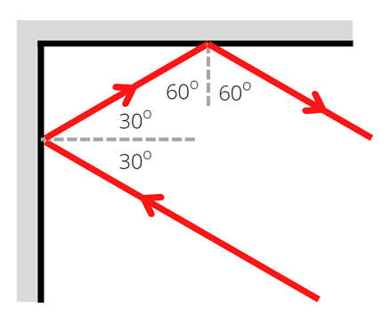 Kąt odbicia od drugiego zwierciadła 60°.