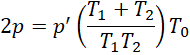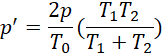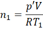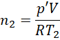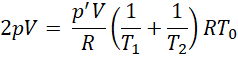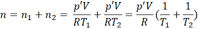 Na podstawie równania Clapeyrona obliczamy ilość moli w obu naczyniach po przemianie. Następnie podstawiamy otrzymany wzór do równania Clapeyrona zapisanego dla stanu początkowego. Przekształcamy wzór i otrzymujemy wynik.
